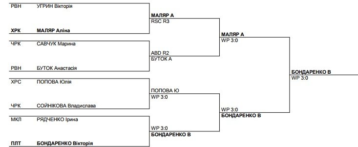 Вікторія Бондаренко з 24 школи змагалася у ваговій категорії 52 кг серед «дівчата» (2004-2005 р.н.). Провівши три поєдинки Вікторія завоювала І місце.