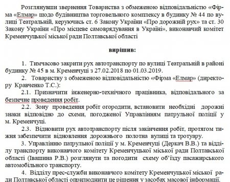 Центральну вулицю Кременчука перекриють на рік до березня 2019 року. Згідно з проектом рішення опублікованого на сайті Кременчуцької міської ради - тимчасове закриття руху автотранспорту по вулиці Театральній в районі будинку № 45