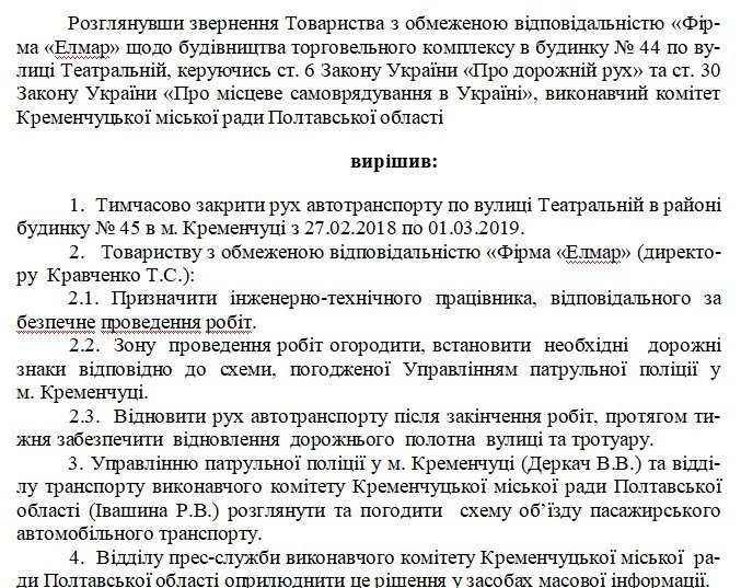 Центральну вулицю Кременчука перекриють на рік до березня 2019 року. Згідно з проектом рішення опублікованого на сайті Кременчуцької міської ради – тимчасове закриття руху автотранспорту по вулиці Театральній в районі будинку № 45