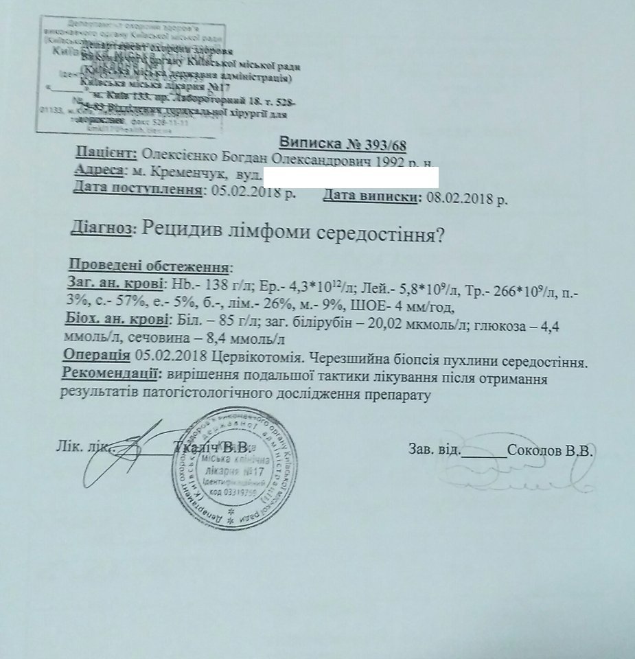– У лютому біда знову постукала в наш дім – зафіксовано рецидив захворювання. На даний момент Богдан потребує високодозової хіміотерапії з подальшою аутотрансплантацією кісткового мозку. Лікарі говорять, що необхідно буде не менше 200 тисяч гривень для лікування. На даний момент наша сім’я не має такої суми для лікування, тому ми прохаємо допомогти всіх небайдужих. Чим раніше ми зберемо гроші, тим швидше Боган почне лікування з підступною хворобою, – додала мама Богдана.