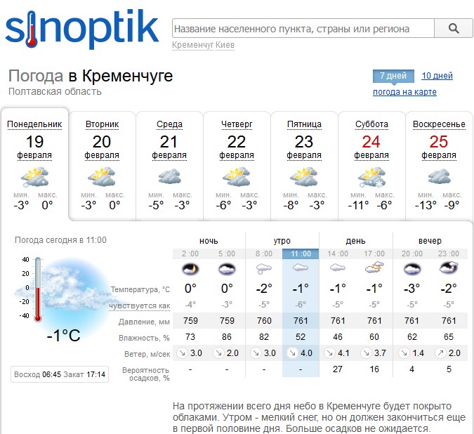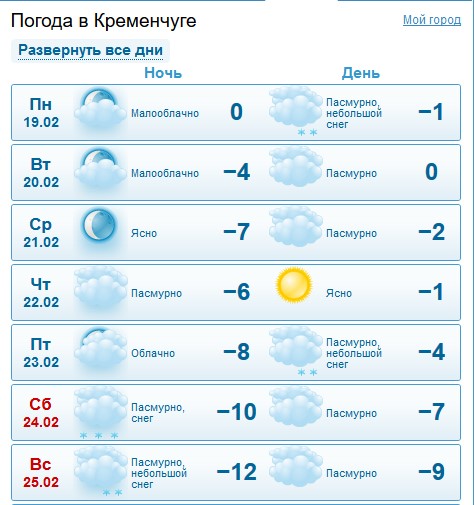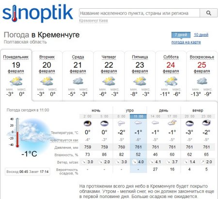 За прогнозом Gismeteo, морози щипатимуть кременчужан щоденно і кожного дня - з більшою силою. Лише сьогодні, 19 лютого, та завтра, 20 лютого, стовпчики термометрів не опустяться нижче 0..-1°C. В інші дні, температура повітря коливатиметься від -4°C до -10°C. У понеділок, 19 лютого, та з п'ятниці по неділю, 23-25 лютого, прогнозують сніг.
