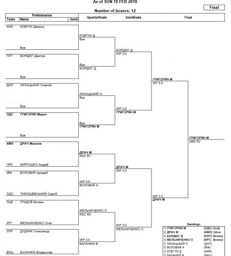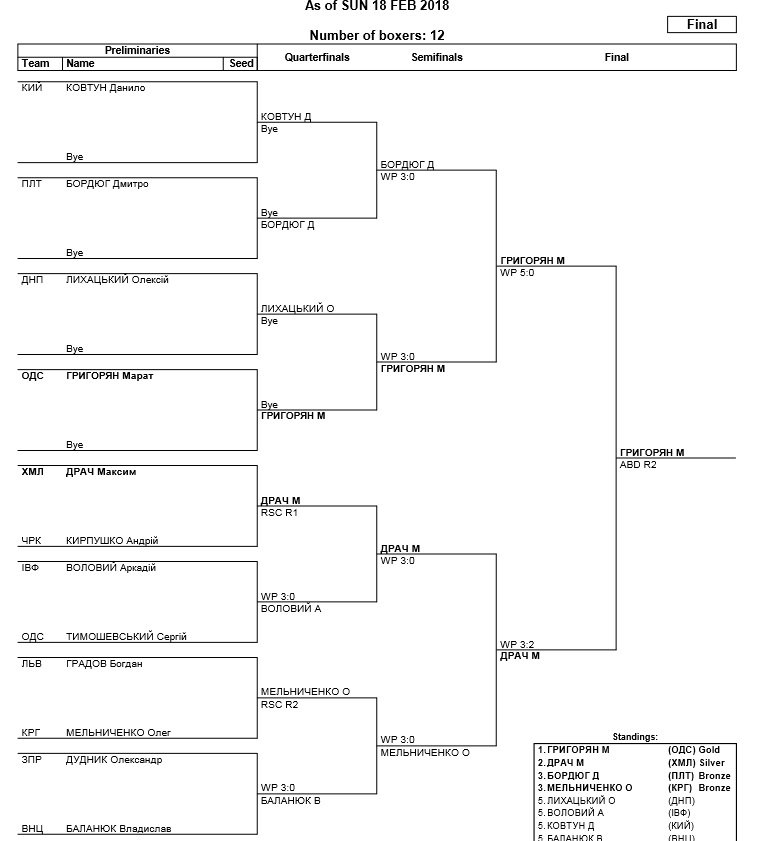 Кременчужанин, одноголосним рішенням суддів, переміг Данила Ковтуна з Києва, але у півфіналі поступився одеситу Марату Григоряну, який у підсумку став чемпіоном.