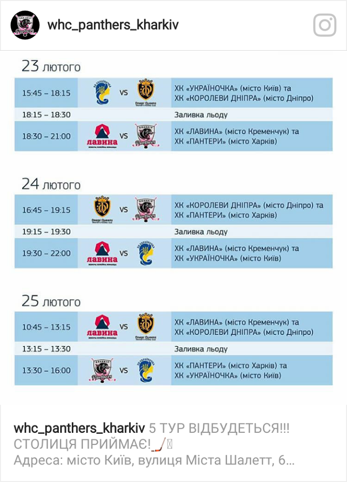 Останній тур Чемпіонату України з жіночого хокею, який мав відбутися у Кременчуці, вирішили перенести до Києва. Відповідну інформацію на своїй сторінці в Instagram розповсюдила харківська команда «Пантери».