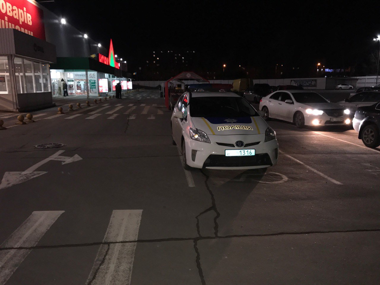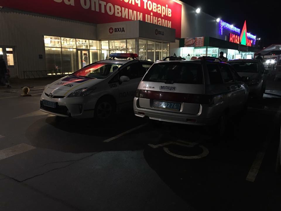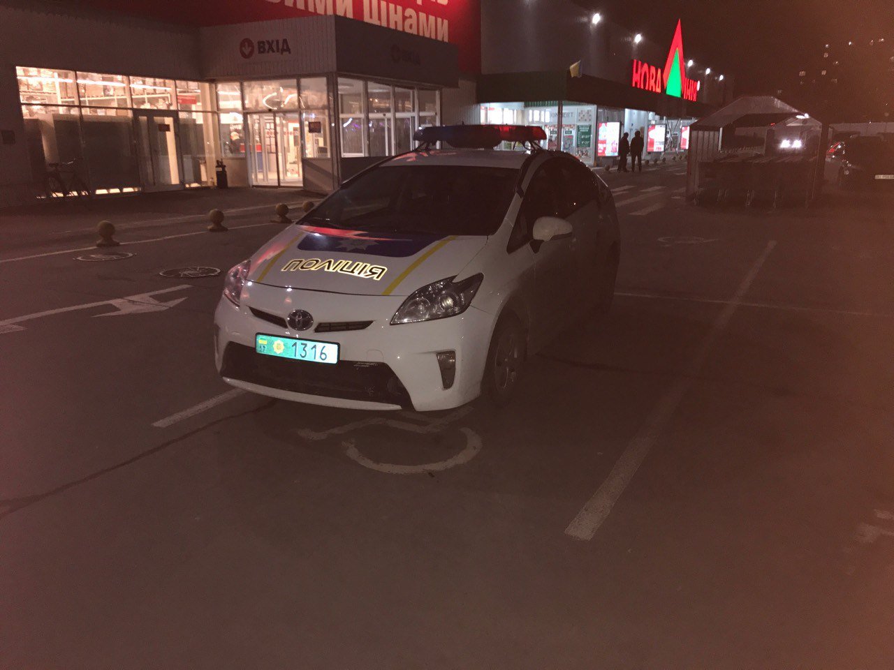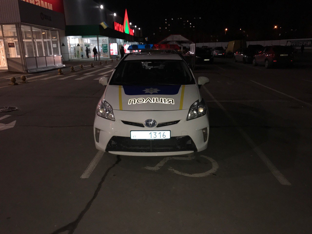 В социальных сетях стала распространятся фотография с полицейской Toyota Prius, которая стоит на месте для инвалидов на парковке у магазина «Новая линия» в Кременчуге. Снято 19 февраля около 19.00.