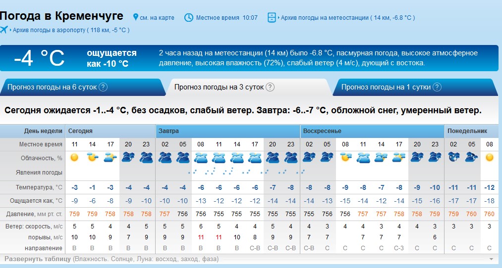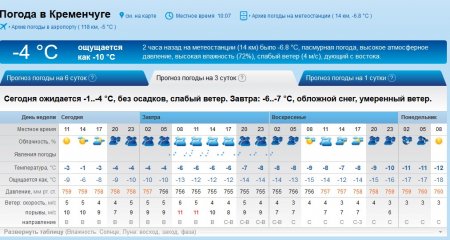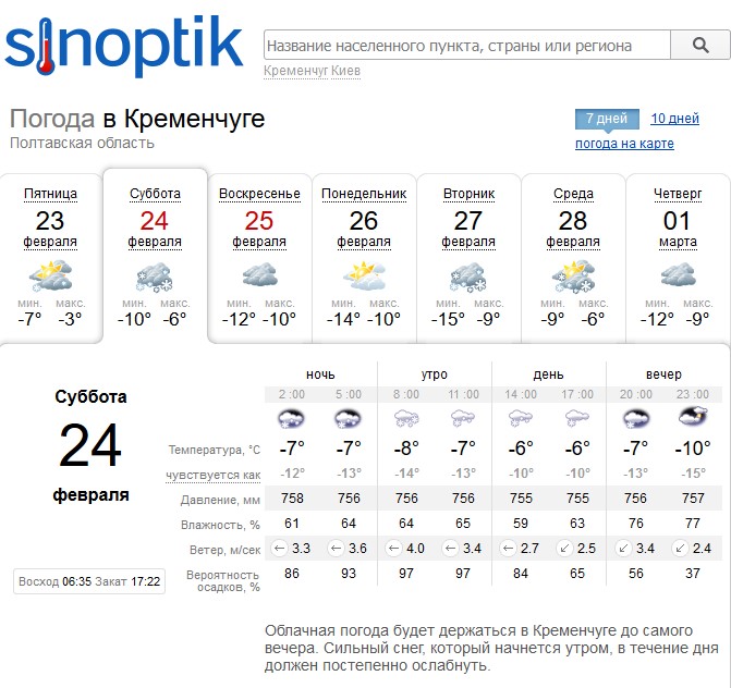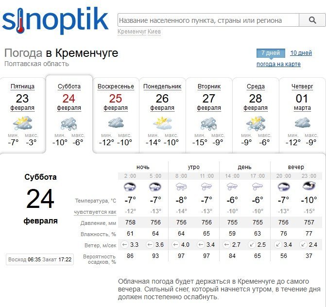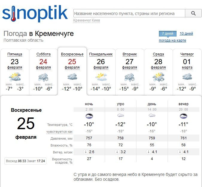 В субботу, 24 февраля, в Кременчуге облачная погода продержится весь день. Сильный снег, который начнется утром, в течение дня должен постепенно ослабнуть, обещает нам Sinoptik. Столбики термометров будут колебаться от -6°C до -10°C.