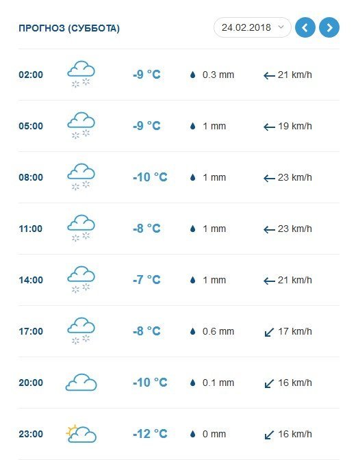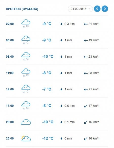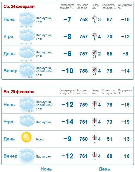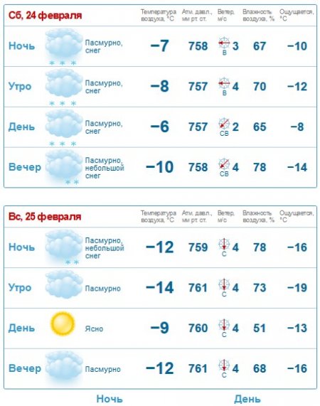Rp5 прогнозирует, что в субботу, 24 февраля, весь день будет идти снег и подымется ветер с порывами до 11 м/с. Ожидаемая температура воздуха от -4°C до -10°C.