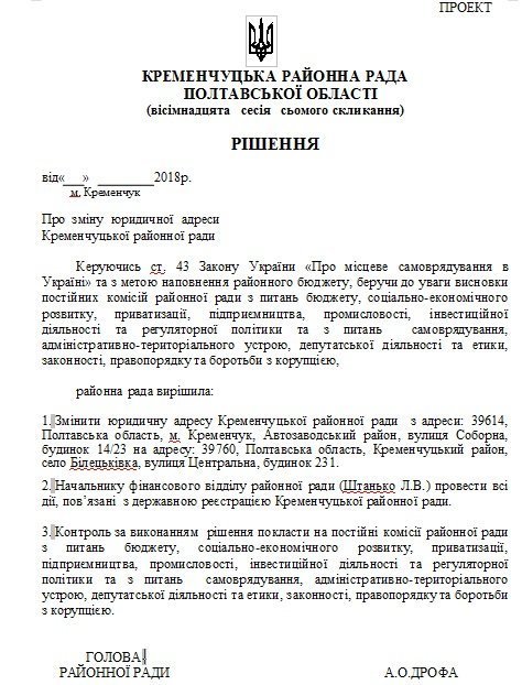 Кременчуцька районна рада планує змінити юридичну адресу з Кременчука на село Білецьківка. Відповідний проект рішення, який винесуть на чергову сесію 7 березня, оприлюднений на сайті Кременчуцької районної ради.