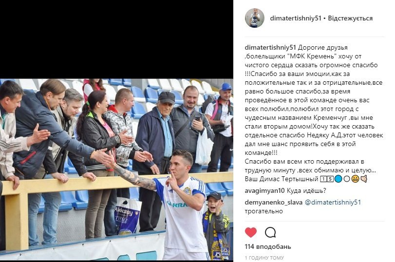 Півзахисник «Кременя» Дмитро Тєртишний покинув клуб, про це футболіст повідомив на своїй сторінці в instagram. У лютому Дмитро був на перегляді в одному з іноземних команд, але зараз футболіст у пошуках нового клубу.