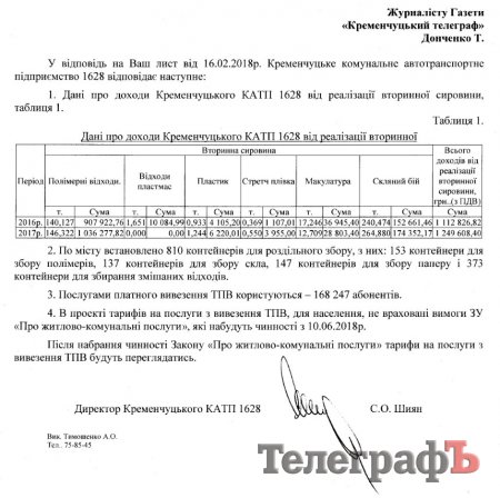 В 2017 году КАТП-1628 заработало 1 млн 249,6 тыс грн на кременчугском мусоре — на реализации вторсырья: полимерных отходов, пластика, стретч-пленки, макулатуры, стеклянного боя. Такую информацию «ТелеграфЪ» получил в ответ на информационный запрос, поданный на предприятие.