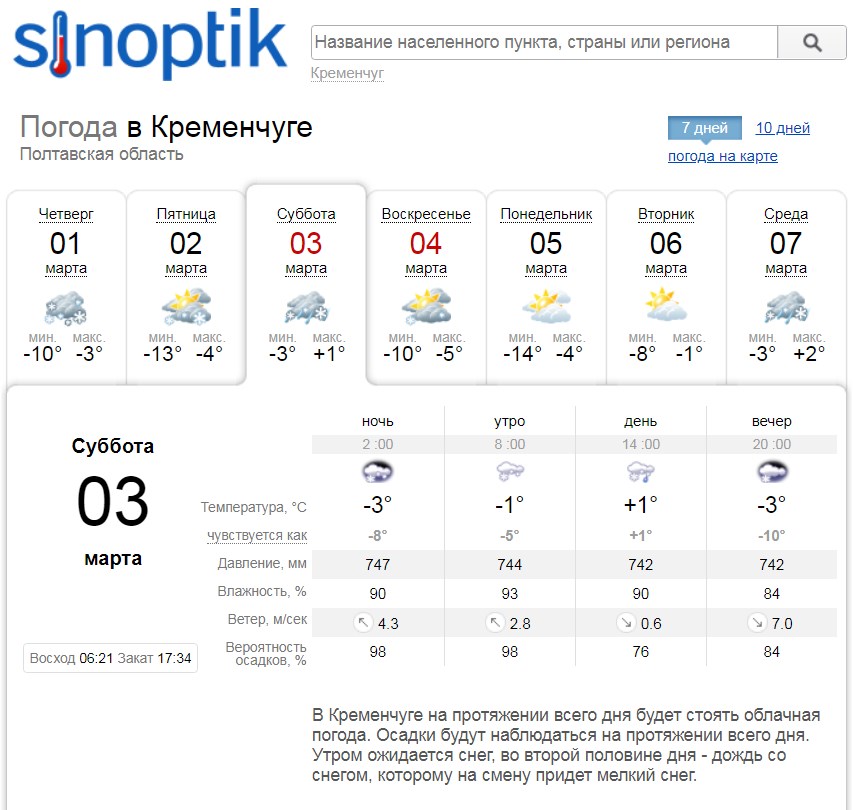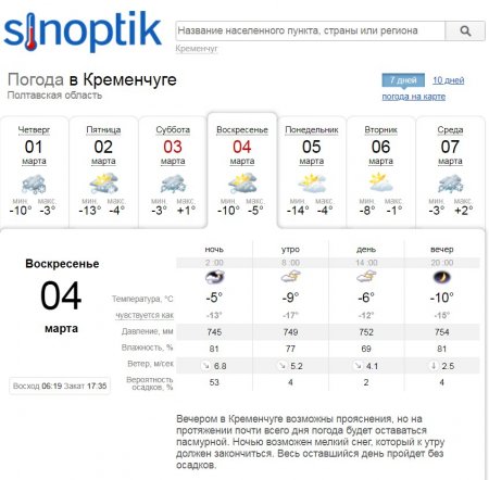 Хмурую погоду на весь викенд кременчужанам прогнозирует и Gismeteo. На температуру воздуха ниже -13°C и выше +1°C рассчитывать не стоит. В субботу, 3-го марта, возможен снег.