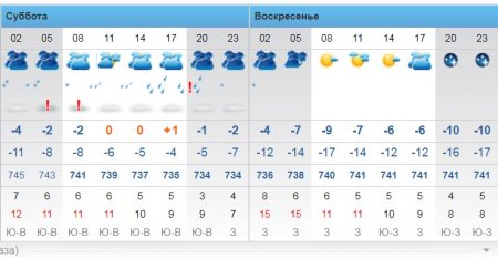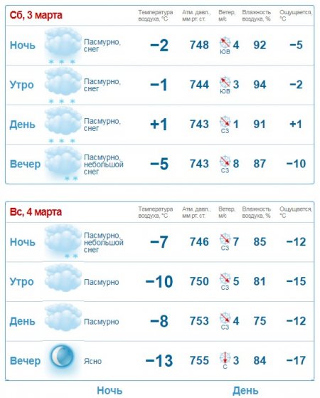 Rp5 прогнозирует, что в субботу, 3-го марта, весь утром будет идти снег, который к обеду превратится в дождь. Подымется ветер с порывами до 12 м/с. На город упадёт дымка. Ожидаемая температура воздуха от -4°C до +1°C. В воскресенье, 4 марта, будет сухо и ветренно - порывы до 15 м/с. Столбики термометров сползут до -10°C.