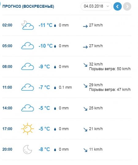 В воскресенье, 4 марта, солнце также редко будет показываться из-за туч. Прогнозируют температуру воздуха от -8°C до -11°C. Сильный ветер с порывами до 13 м/с, без осадков.