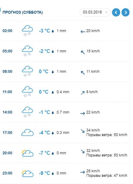 В субботу, 3-го марта, Ventusky прогнозирует хмурую и снежную погоду. Снег будет идти в первой половине дня, а к вечеру подымется сильный ветер с порывами до 13 м/с. Температура воздуха будет постепенно снижаться с 0°C до -10°C.