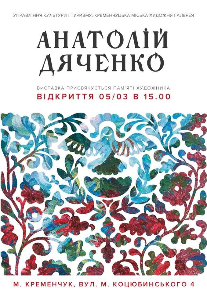 5 березня о 15.00 в Кременчуцькій художній галереї (вул. Коцюбинського, 5) відкриття виставки – пам’яті художника і педагога Дяченка Анатолія Давидовича, члена Національної спілки художників України.