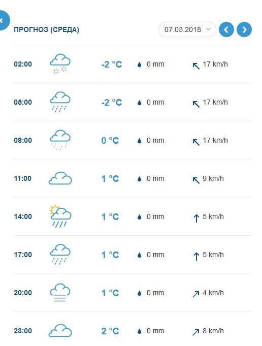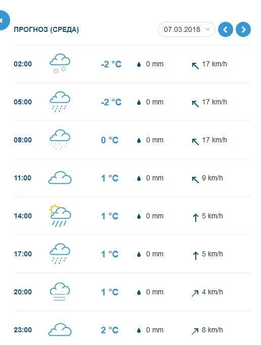 За прогнозом Gismeteo, дощик накрапатиме у середу-четвер, 7-8 березня, та у суботу, 10 березня. Температура повітря коливатиметься від -5°C до +5°C.