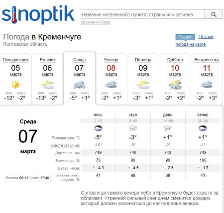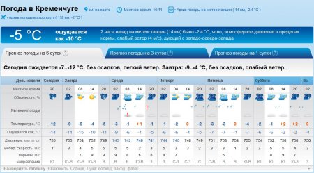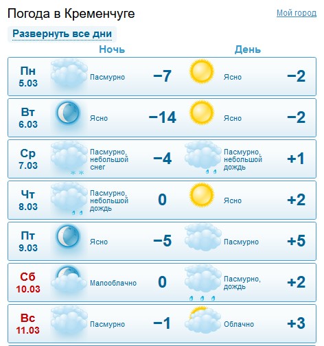 На rp5 кременчужан попереджають, що з середи, 7 березня, і до кінця тижня Кременчук буде оповитий серпанком. У середу, 7 березня, та суботу, 10 березня, дощитиме, а у п'ятницю, 9 березня, йтиме сніг. Температура повітря триматиметься на рівні -5°C...+3°C.