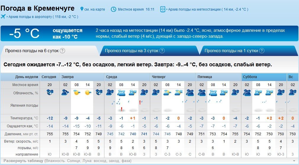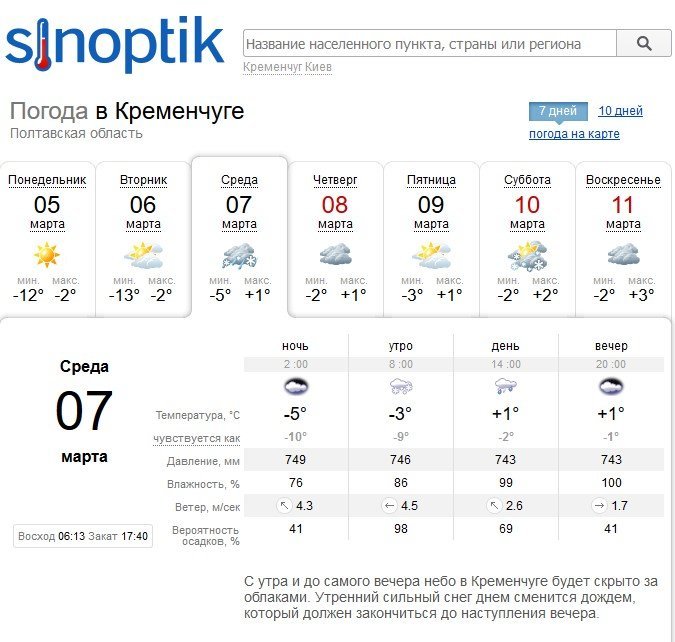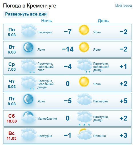 На rp5 кременчужан попереджають, що з середи, 7 березня, і до кінця тижня Кременчук буде оповитий серпанком. У середу, 7 березня, та суботу, 10 березня, дощитиме, а у п’ятницю, 9 березня, йтиме сніг. Температура повітря триматиметься на рівні -5°C…+3°C.