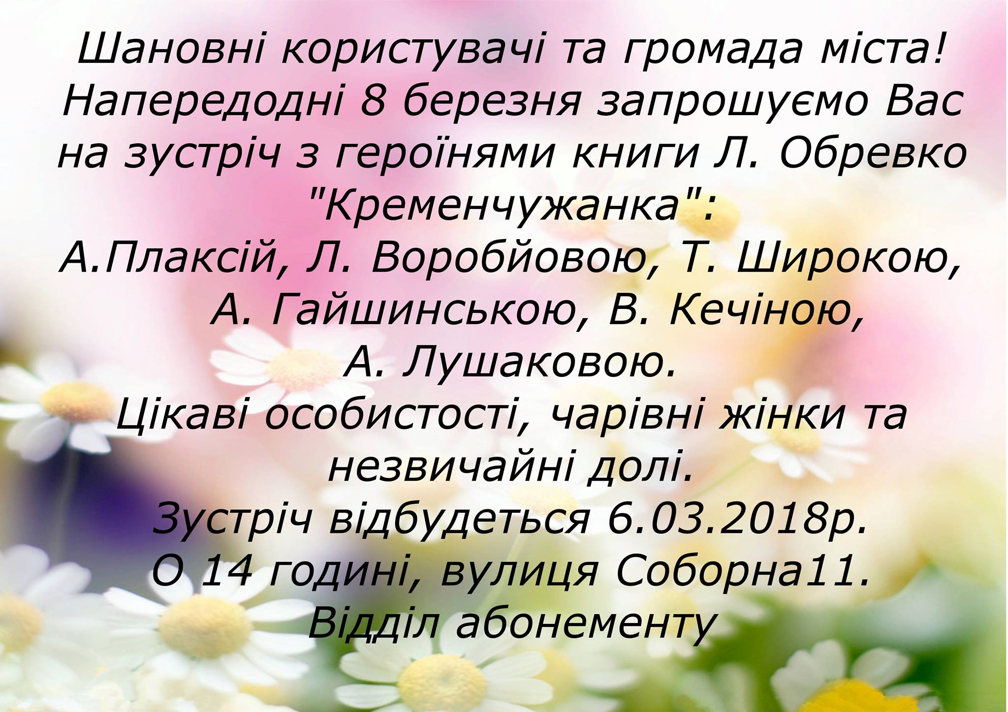 Що: зустріч з героїнями книги Л.Обревко «Кременчужанка»: А.Плаксій, Л.Воробйовою, Т.Широкою, А.Гайшинською, В.Кечіною, А.Лукашовою