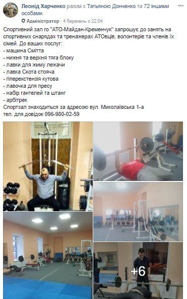 Спортивний зал з тренажерами відкрив свої двері для АТОвців, волонтерів та членів їх родин. Про це повідомив керівник організації «АТО-Майдан-Кременчук» Леонід Харченко.