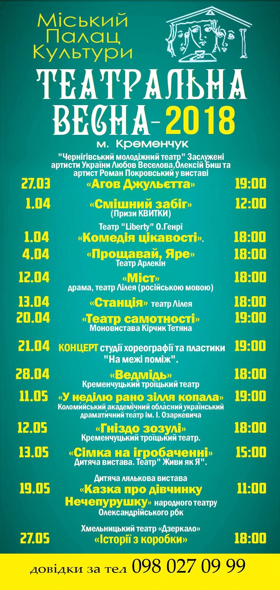 | 27 березня | 19.00 | "Чернігівський молодіжний театр" Заслужені артисти України Любов Веселова, Олексій Биш та артист Роман Покровський у виставі "Агов Джульєтта" |
