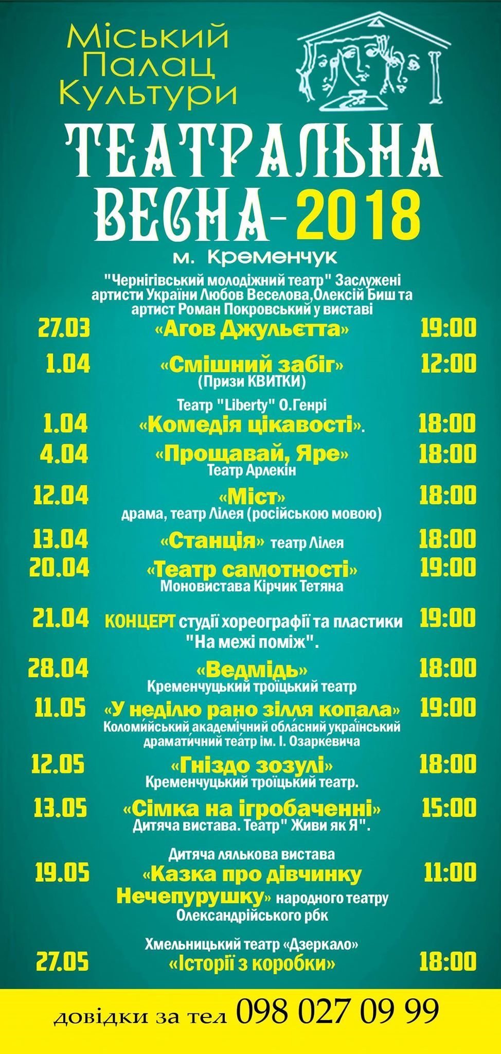 | 27 березня | 19.00 | «Чернігівський молодіжний театр» Заслужені артисти України Любов Веселова, Олексій Биш та артист Роман Покровський у виставі «Агов Джульєтта» |