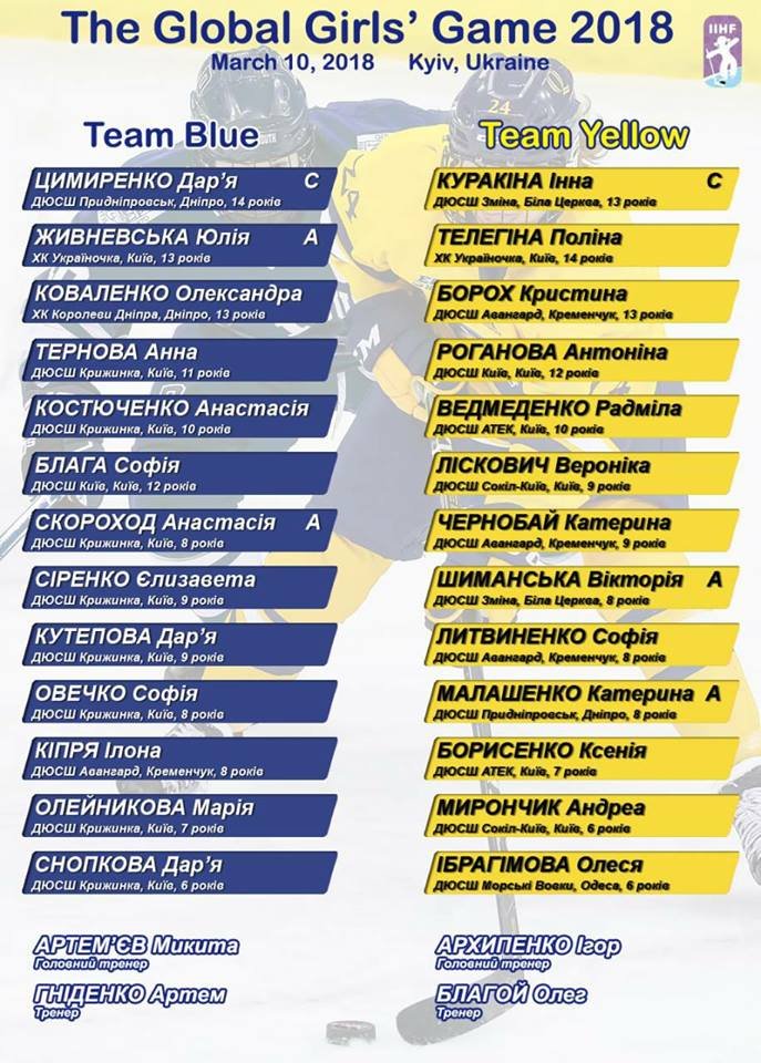 У підсумку на IIHF Global Girls’ Game 2018 у Києві зіграють три кременчуцькі хокеїстки - вихованки СДЮСШОР «Авангард»: Кипря Ілона, Борох Христина та Чернобай Катерина.