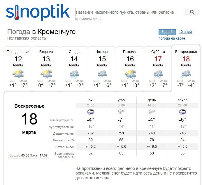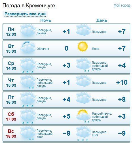 На rp5 кременчужан попереджають, що з четверга, 15 березня, і до кінця тижня Кременчук буде оповитий серпанком. Від сьогодні і до середи, 14 березня, буде вітряно – пориви до 14 м/с. Щодня можливі дощі. Температура повітря коливатиметься від +1°C…+9°C.