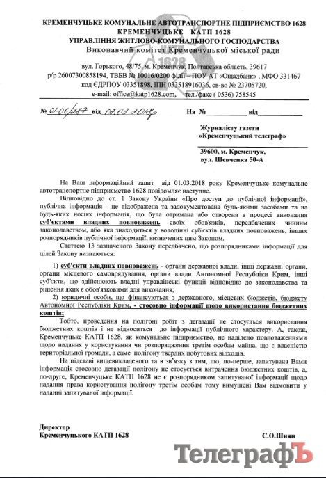 КАТП 1628 відмовилося надати «Телеграфу» договір на дегазацію полігону твердих побутових відходів з ТОВ КЛІАР ЕНЕРЖДІ-КРЕМЕНЧУК.