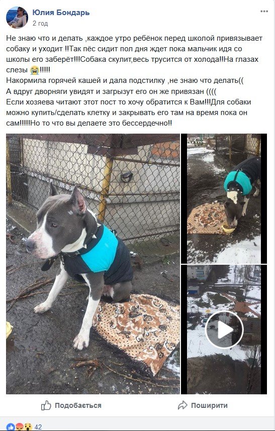 15 марта плавчанка Юлия Бондарь опубликовала в Facebook пост о собаке, которую каждое утро ребёнок привзывает к школьному забору, уходя на уроки. Пост вызвал ажиотаж в комментариях.