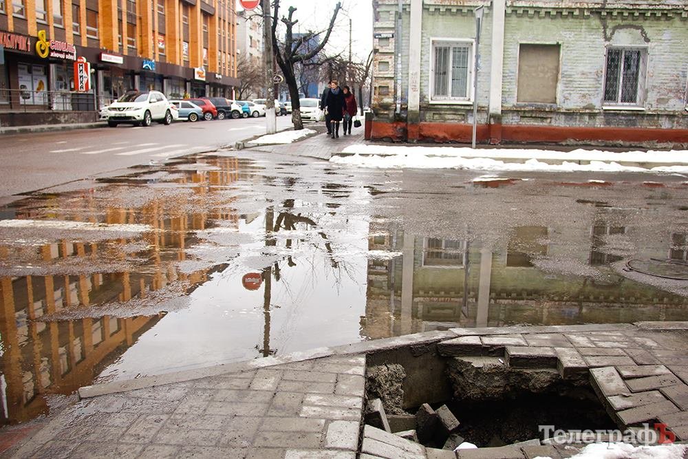 13 марта на тротуаре в районе перекрёстка ул. Шевченко и ул. Майора Борищака образовалась яма. Она расположена опасно – в единственном месте, где пешеходы могут обойти постоянные лужи.