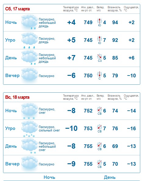 Rp5 прогнозирует, что в субботу, 17 марта, и воскресенье, 18 марта, город окутает густой туман с видимостью меньше 1 км. Ожидаемая температура воздуха от -7°C до +9°C. В субботу возможен дождь, а в воскресенье - снег и снег с дождём. Подымется сильный ветер с порывами до 16 м/с.