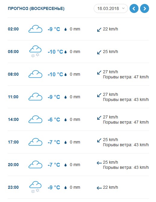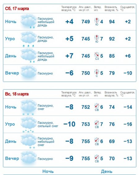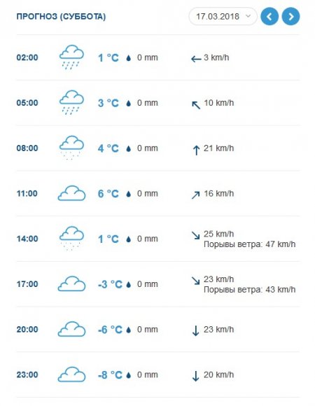 В субботу, 17 марта, Ventusky прогнозирует дождь утром, который к обеду превратиться в мелкий снег. Порывы ветра достигнут 13 м/с. Температура воздуха будет постепенно снижаться с +6°C до -8°C.
