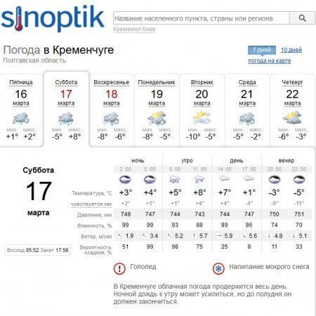 В субботу, 17 марта, облачная погода продержится весь день. Ночной дождь к утру может усилиться, но до полудня он должен закончиться, прогнозирует Sinoptik. Также кременчужан предупреждают о гололёде и налипании мокрого снега. Температура воздуха будет держаться в пределах от -8°C до +5°C.