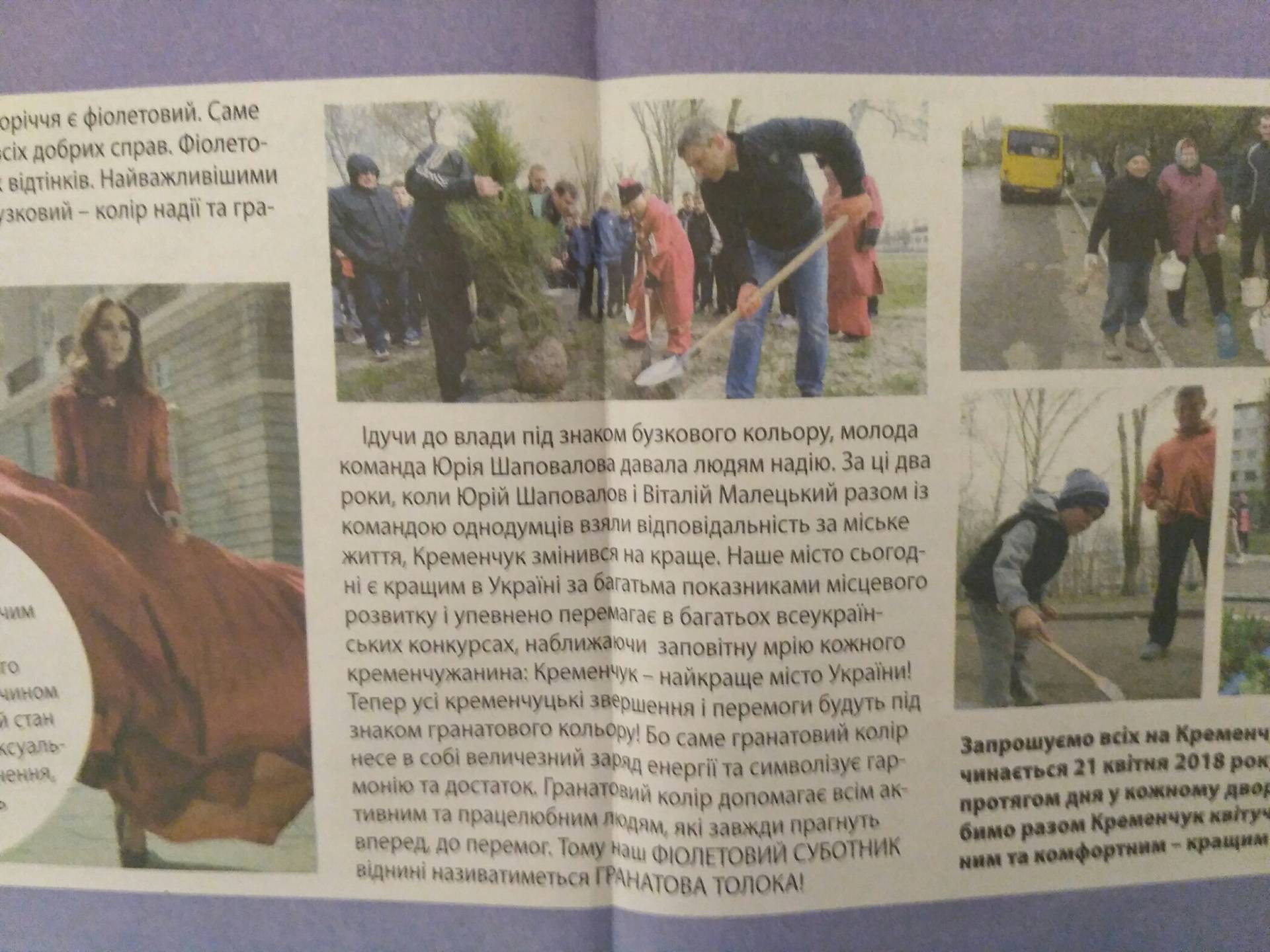 Команда нардепа Юрия Шаповалова и мэра Кременчуга Виталия Малецкого сменила корпоративный цвет с фиолетового на гранатовый. Об этом заявлено в корпоративном издании, где люди информируются, что «фиолетовых субботников больше не будет, теперь будет гранатовая толока».