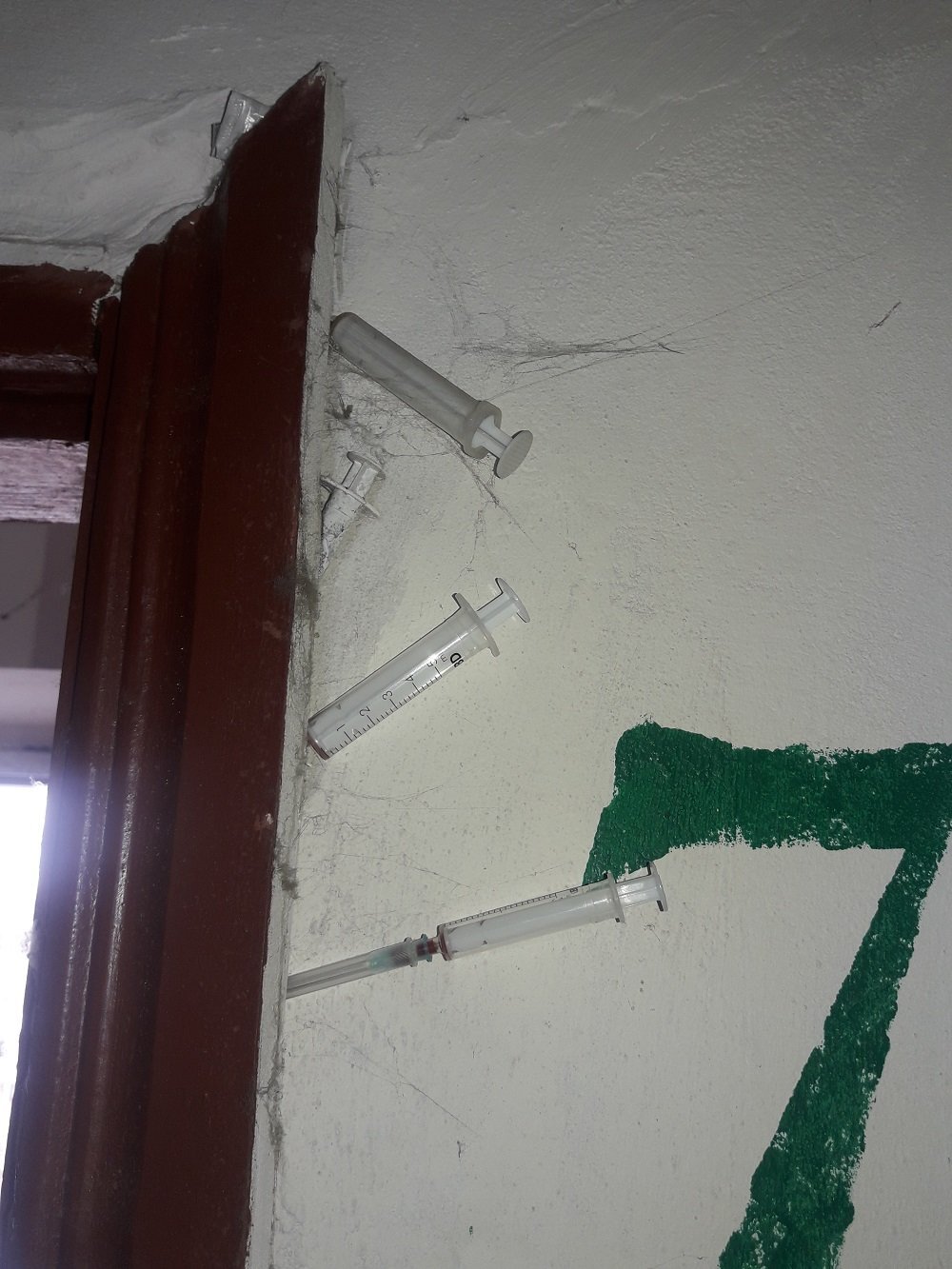 До редакції «Телеграф» звернувся кременчужанин Олександр, який живе в районі річного вокзалу за адресою вул. Першотравнева, 3. Чоловік надіслав фото, на якому видно, що шприци з кров’ю розміщені на висоті, до якої можуть дістатися підлітки.