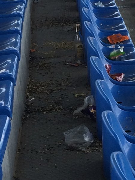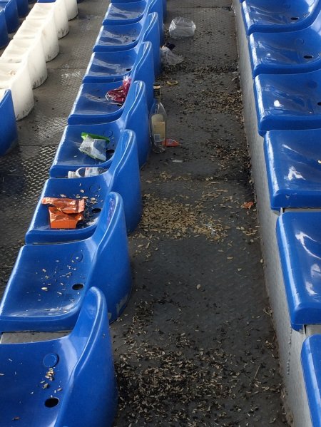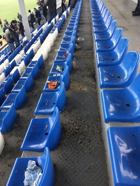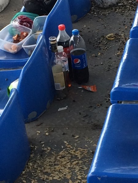 На стадионе столкнулся с болельщиками из Горишних Плавней, которые плевали семечки себе под ноги, распивали спиртные напитки и курили, на замечания был один ответ «МЫ в гостях нам можно». На вид все были интеллигентного вида, хорошо одеты (у некоторых курточки были «Гірник-Спорт») не быдло как показалось. Но что они оставили после себя на стадионе повергло в ужас.