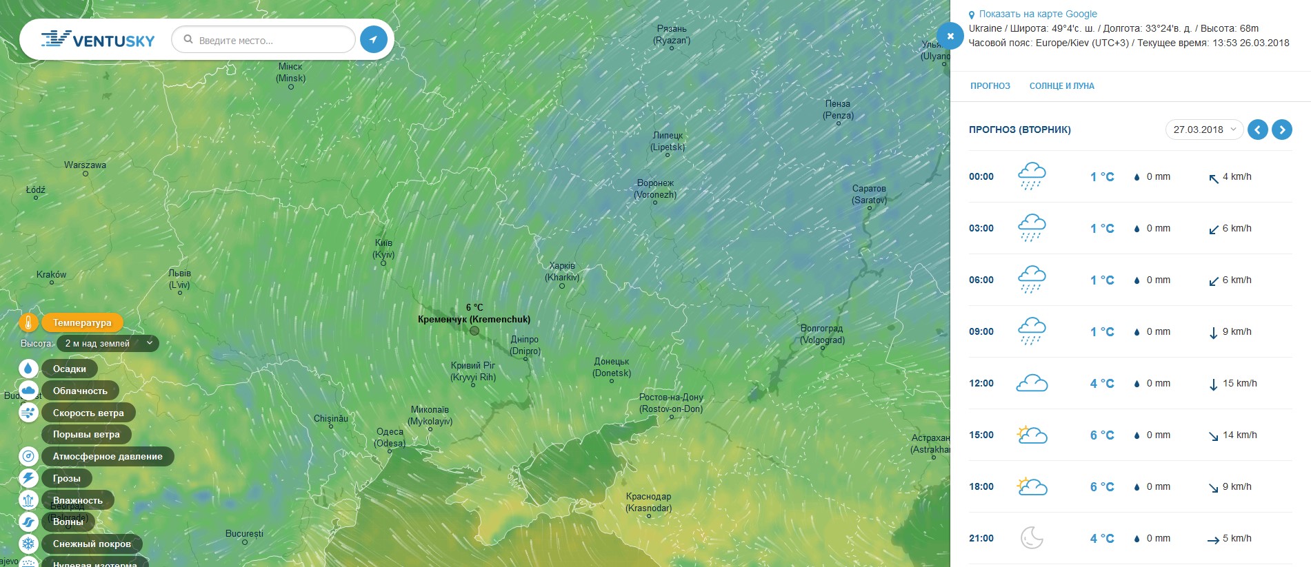 Ventusky прогнозує, що дощити почне у вівторок, 27 березня, зранку. Стовпчики термометрів не опустяться нижче +1°C.