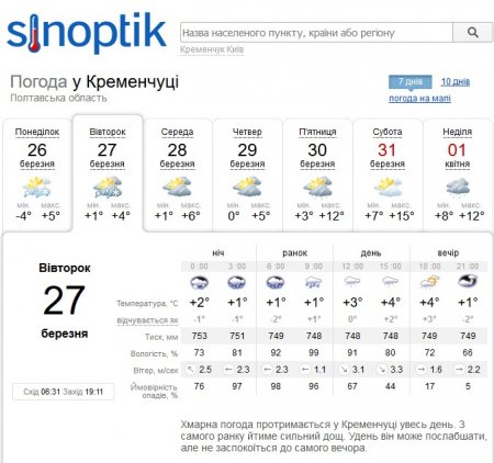 На rp5 нас попереджають, що зранку у вівторок, 27 березня, та четвер, 29 березня, Кременчук буде оповитий серпанком. У вівторок та середу, 27 та 28 березня, можливий дощ. У вихідні, 31 березня-1 квітня, здійметься сильний вітер з поривати до 13 м/с. Максимальна прогнозована температура повітря +13°C, мінімальна - 0°C.