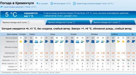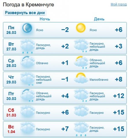 На Gismeteo кременчужанам прогнозують сніг у четвер, 29 березня, і дощ майже щодня, крім суботи, 31 березня. Температура повітря триматиметься на рівні від -1°C до +15°C.