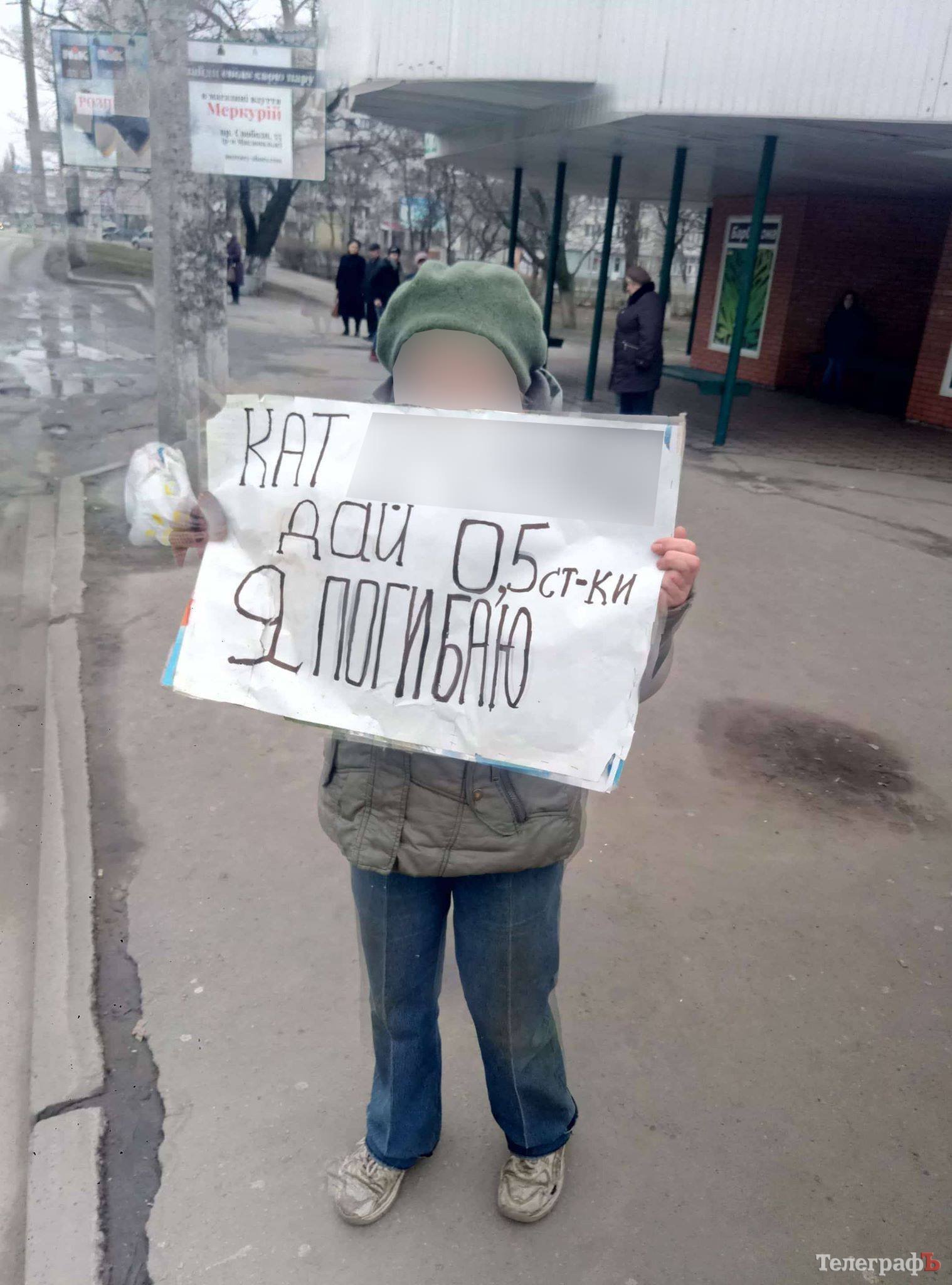Женщина стоит с плакатом: «Дай 0,5 ст-ки. Я погибаю».