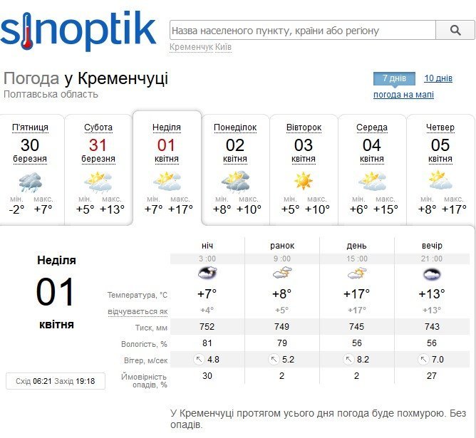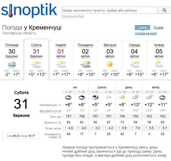 Sinoptik же обіцяє кременчужанам мілкий дощ у суботу, 31 березня, зранку та ввечері. Температура повітря триматиметься на рівні +5°C…+13°C. У неділю, 1 квітня, потеплішає до +17°C.