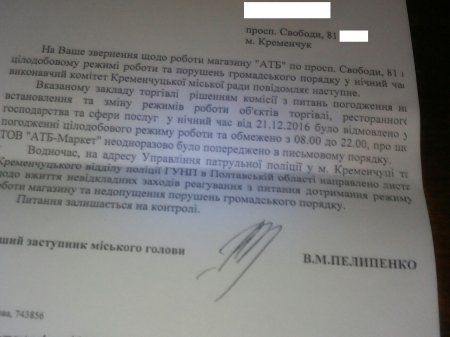 До редакції “Телеграфу” звернулася кременчужанка Оксана, яка мешкає в районі Пивзаводу. За її словами, магазин, який розміщений в їх будинку на першому поверсі працює в нічний час і це створює незручності мешканцям: п'яні драки, громадський туалет. Жінка отримала відповідь на запит в якому значиться, що магазин не має дозволу на торгівлю в нічний час.