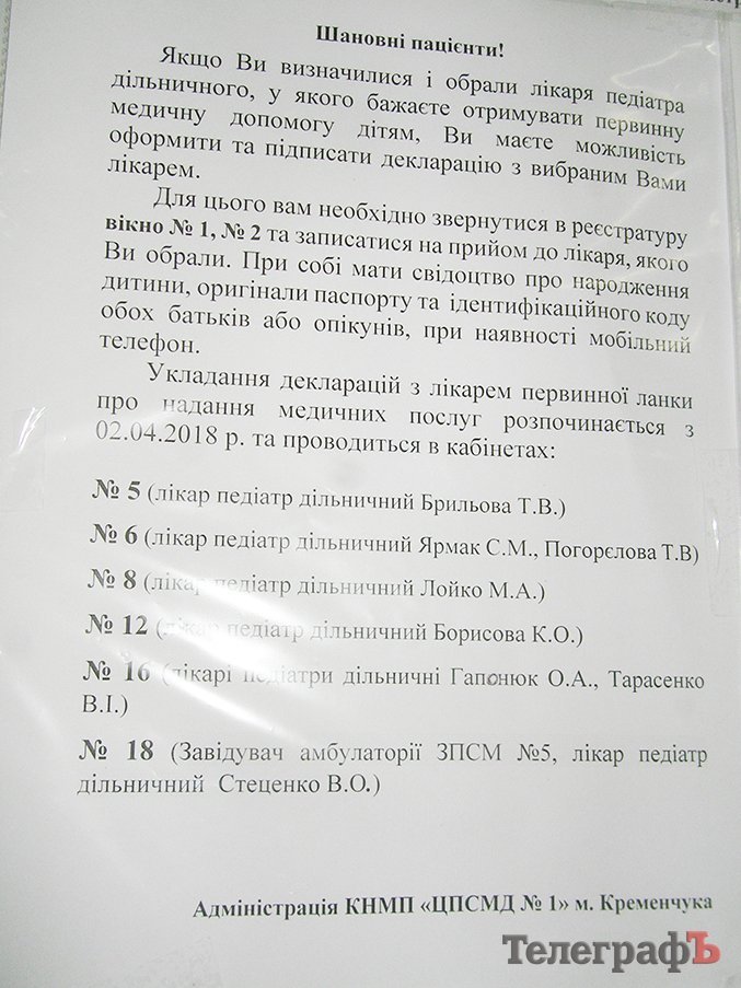 Сегодня, 2-го апреля, началась официальная компания подписания деклараций с детскими врачами – педиатрами. «Телеграф» побывал в амбулатории №5 (бывшая детская поликлиника на бывшей улице Советской). Ажиотажа и очередей в помещении амбулатории нет. Работа идет в штатном режиме. Администрация амбулатории сообщила, что сегодня в первой половине дня подписали декларацию 5 человек. В целом же предварительно зарегистрировались для подписания деклараций более 300 человек. Каждому из них назначено конкретное время приема, сделано это, чтобы избежать образования очередей. Работу по подготовке списков желающих подписать декларацию вели сотрудники амбулатории.