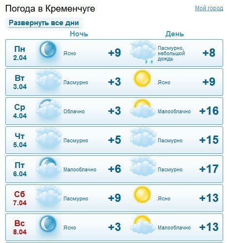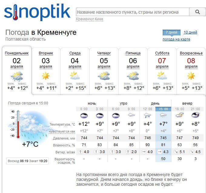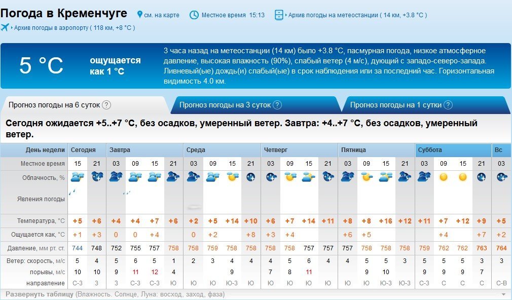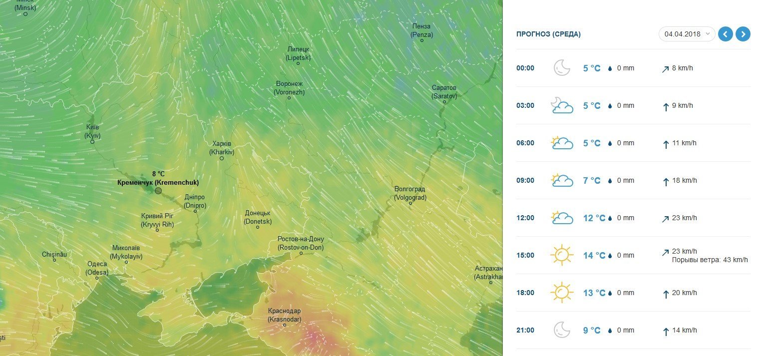 На rp5 нас попереджають, що зранку у середу, 4 квітня, Кременчук буде оповитий серпанком. У вівторок, 3-го квітня, можливий дощ. У вівторок та четвер, 3-5 квітня, здійметься сильний вітер з поривати до 12 м/с. Максимальна прогнозована температура повітря +16°C, мінімальна – +2°C.