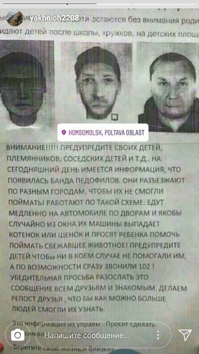 На ней изображены лица троих мужчин. Под ними подписано, что в городе орудует банда педофилов и необходимо об этом предупредить всех детей и родителей. Даже приводится схема: «банда» едет на автомобиле по двору и «выбрасывают» из окна щенка или котёнка, просят кого-то из детей поймать его. Что происходит дальше, гражданам предлагается дофантазировать.