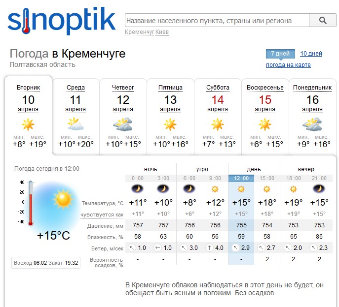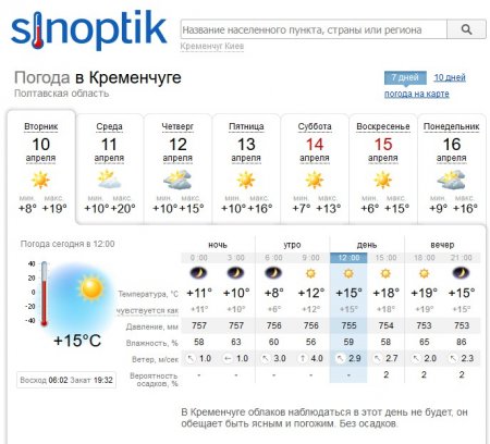 На Gismeteo кременчужанам прогнозують, що пасмурно буде у середу та четвер, 11-12 квітня. У ці ж дні стовпчики термометрів доповзуть до +21°C.