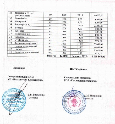 Всего цветов и растений для клумб закупят 43 наименования – 124 450 штук. Информация о результатах тендера и договор с победителем – ООО «Голландські троянди» размещена в системе электронных закупок ProZorro. Цена договора, заключенного 10 апреля – 1 миллион 269,9 тысяч гривен. Предприятием «Голландські троянди» руководит бывший первый вице-мэр Кременчуга Андрей Погребной. Оно из года в год выигрывает все тендеры на поставку деревьев и цветов.