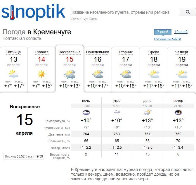 Sinoptik обіцяє кременчужанам ясну та сонячну погоду лише у суботу, 14 квітня. А у неділю, 15 квітня – дощ. Температура повітря триматиметься на рівні +8°C…+16°C.