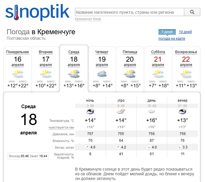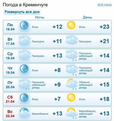 На Gismeteo кременчужанам прогнозують, що дощу слід чекати щодня з середи, 18 квітня, і до п'ятниці, 20 квітня, включно. А також у неділю, 22 квітня. На початку тижня стовпчики термометрів доповзуть до +23°C, а потім температура повітря коливатиметься від +8°C до +18°C.