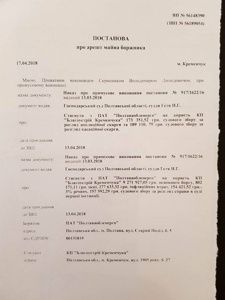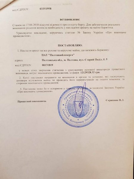 17 апреля частный судебный исполнитель Владимир Скрипник своим постановлением арестовал имущество ПАО «Полтаваоблэнерго». Об этом сообщил адвокат и депутат горсовета, представляющий в судах интересы коммунальных предприятий Руслан Ульянов. Он выложил на своей странице в Facebook Постановление об аресте имущества должника.